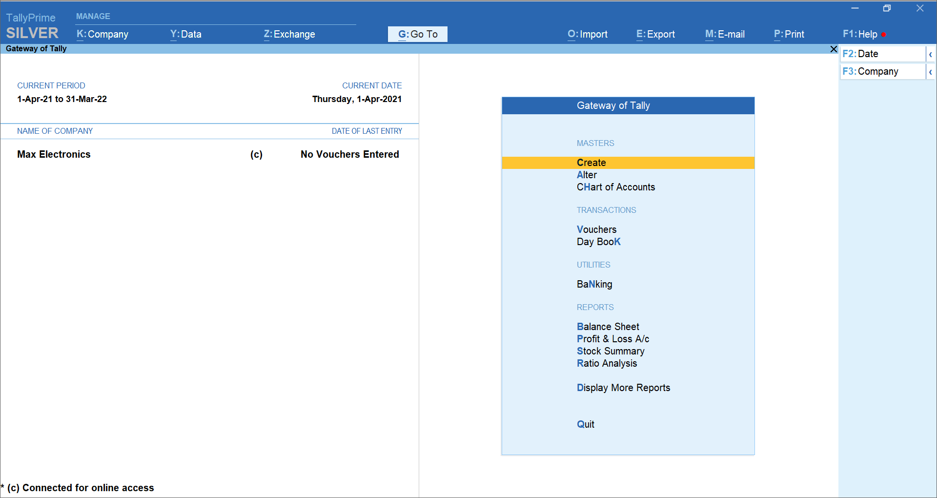 - Enabled relevant features (F11 → Accounting Features / F3 → Statutory & Taxation) if taxes are involved.
